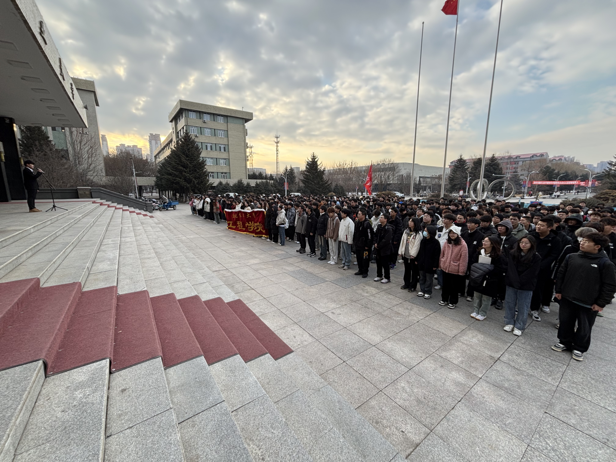 清晨,全体师生齐聚主楼,鲜艳的五星红旗在学校国旗护卫队的护卫下,在嘹亮的国歌声中冉冉升起,全体师生行注目礼。升旗结束后,工一2405班徐浩洋同学代表与会全体同学发言。他在发言中讲到:升旗仪式不仅是仪式,更是唤醒,当我们凝视国旗时,看到的不仅是过去的苦难与现在的辉煌,更应是未来的责任。作为新时代的青年,要以习近平新时代中国特色社会主义思想为指引,树立报国之志、成为国之栋梁;他号召全体工程学子以实际行动践行学校第四次党代会精神,爱校如家、当好主人翁,成为学校发展的参与者和建设者。发言最后,他向所有与会同学赠予了一句话:愿我们永远保持此刻仰望国旗时眼里的光,让青春在五星红旗下绽放出最炽热的光芒!