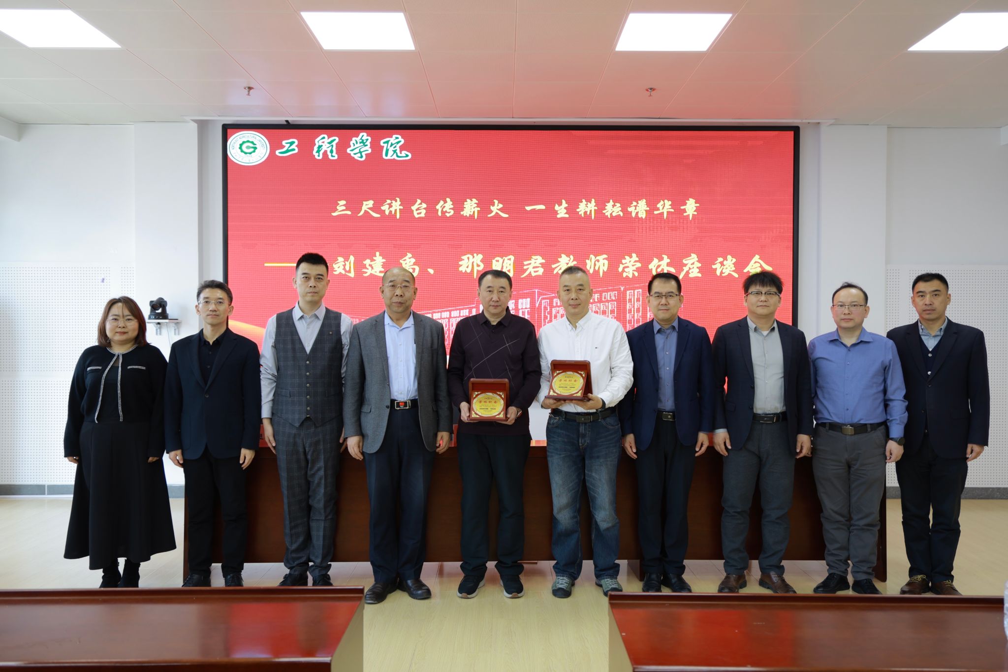 荣光时刻,镌刻教育印记工会主席窦大昶为两位教师颁发特制荣休纪念铭牌,新入职教师代表敬献鲜花,象征教育事业的薪火相传。刘建禹、那明君两位教师在感言中细数参与学院建设的珍贵记忆,分享三尺讲台育桃李的教育心得,表达对学院发展的深切期许,承诺将继续关注和支持学院工作。现场温馨感人的氛围,凝聚着全院师生对荣休教师的崇高敬意。