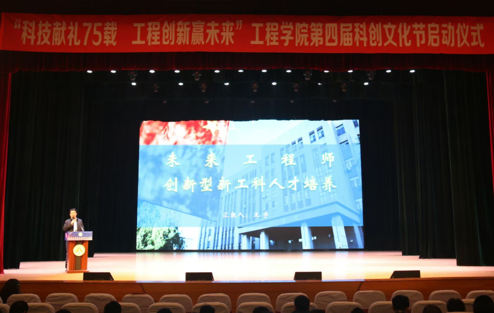 为培养大学生科研精神,营造良好校园科创文化氛围,提高学生的科研能力和创新精神,为工程学子筑牢“科技报国”的坚实基础,bv1946伟德于11月6日在音乐厅举办第四届科创文化节启动仪式,本届科创文化节以“科技献礼75载,工程创新赢未来”为主题。学院党委书记黄步海,行政负责人李岩,校团委副书记焦文静,学院副院长臧宏、李伟、王立军、王金峰,学院教师代表、全体辅导员、2024级全体研究生和本科生参加启动仪式。学院党委副书记孙涛主持启动仪式。