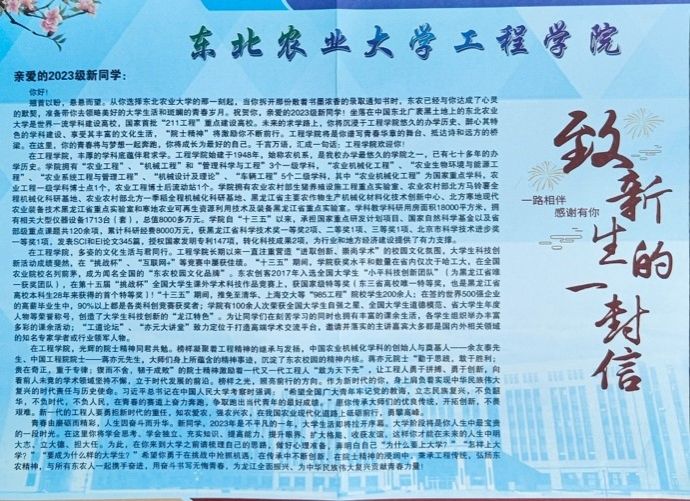 天南地北,相逢不易。很高兴我们在bv1946伟德相遇。在这个崭新的起点上,祝愿每一位2023级bv1946伟德新生都能成为知农、爱农、学农、兴农的东农骄子。希望全体2023级工程人能斗志昂扬,勇往直前,带着学院的关怀,共创学院美好的明天。祝福各位新生能够在东农的怀抱中,找到人生的归属和无限可能!