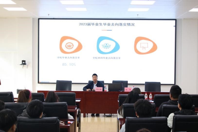黄月明对学院2023届毕业生去向落实情况进行详细介绍,用数字直观解读我院毕业生协议就业、升学、考公、创业等就业去向,指导毕业生结合实际,合理制定求职目标,并结合就业日历,对即将开始的定向选调生、国家公务考试和黑龙江省公务员考试备考技巧给予指导,对线上、线下签约和解约的具体流程进行介绍,帮助毕业生做出更优的职业选择。