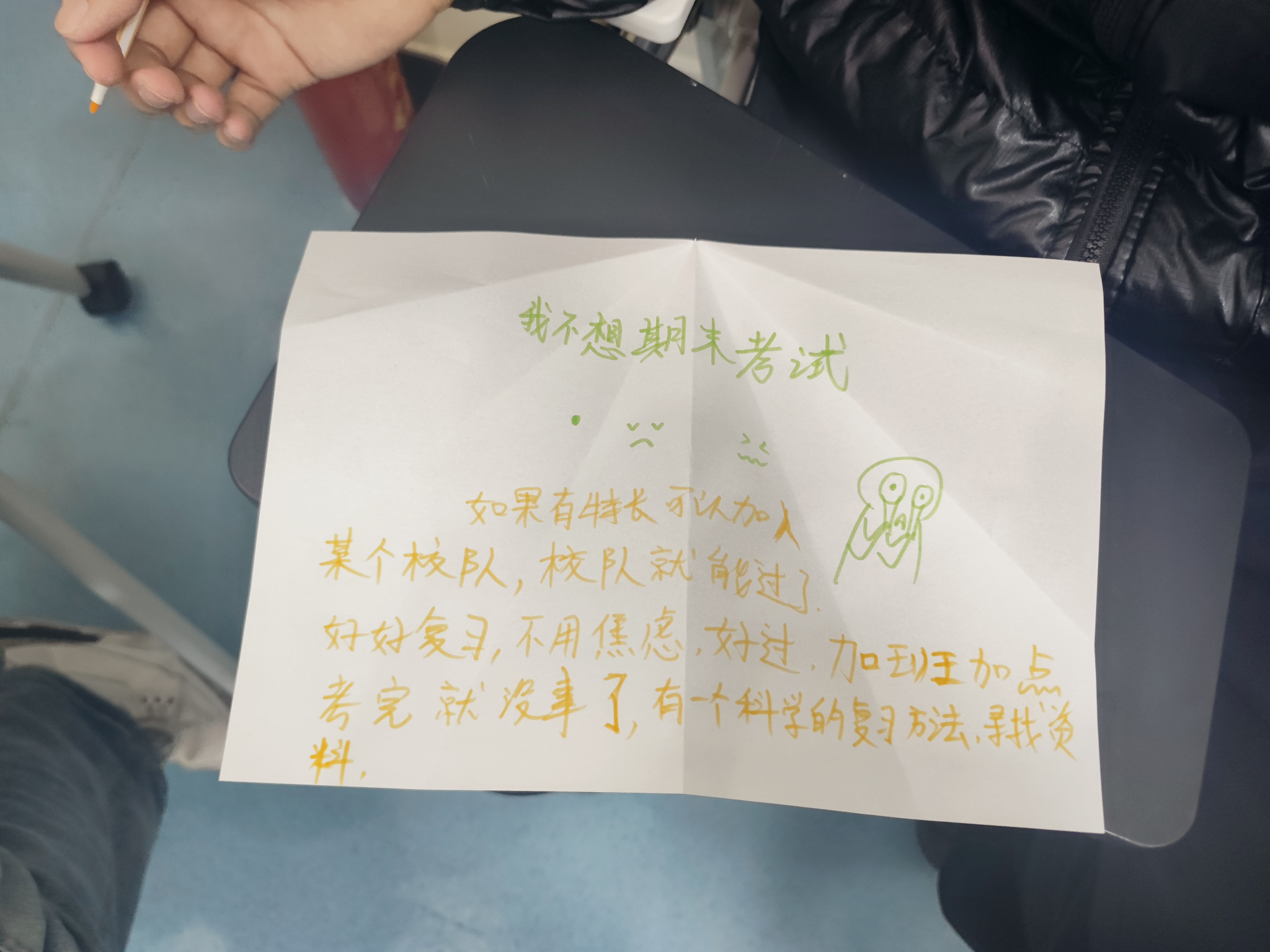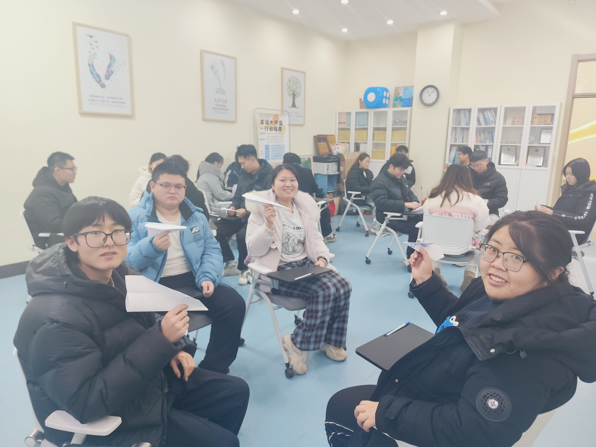 在分组交流环节,同学们彼此介绍、倾听分享,建立起真诚的心灵连接。紧随其后的放飞压力活动则别具匠心,大家将近期压力匿名写下,折成纸飞机随机放飞,并共同为抽取到的压力事件提供建议与支持,在实践中学习共情与互助。