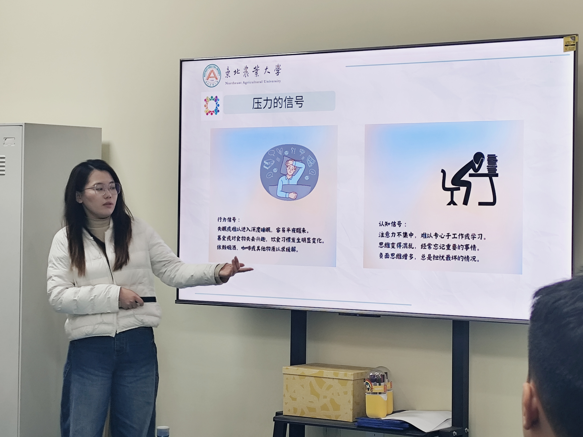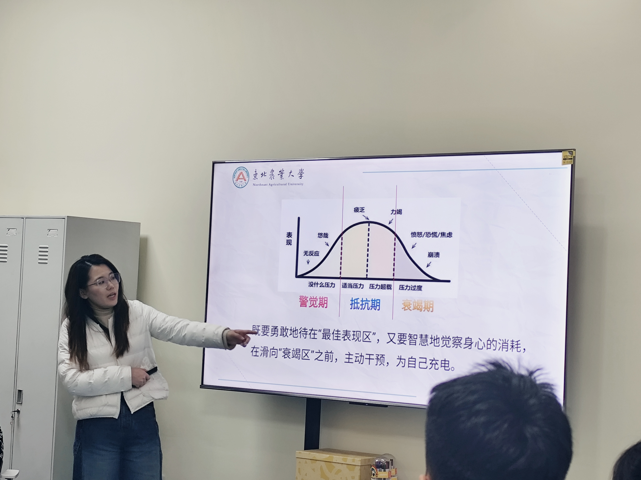 姚雪老师结合专业知识,系统讲解了压力的情绪、认知、行为与生理信号,并借助耶克斯-多德森定律和压力阶段曲线,阐释了适度压力的积极意义与科学调节方法,引导同学们识别自身状态,保持在最佳表现区。活动最后,全体成员共同参与集体按摩操,在轻松的动作与欢声笑语中传递关怀、释放紧张,为本次辅导画上了温暖而有力的句号。